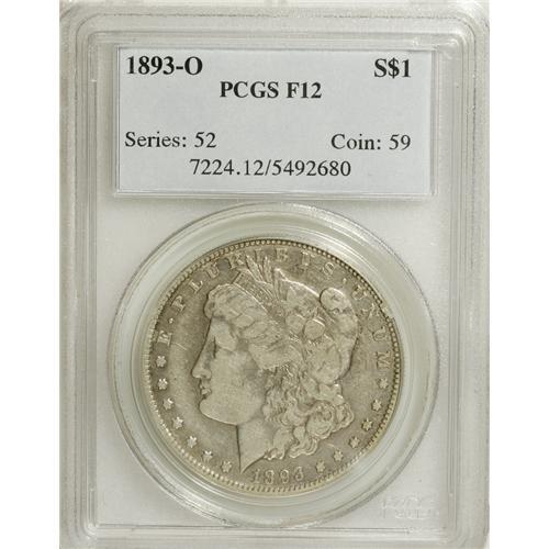 <B>1893-O $1 F12 PCGS.</B></I> PCGS Population (23/1921). NGC Census: (63/3113). Mintage: 300,000. Numismedia Wsl. Price for NGC/PCGS coin in F12: $191. (#7224)<BR><BR><b>Shipping:</b> Coins & Currency (<a target="_blank" href="http://www.heritageauctions.com/common/shipping.php">view shipping information</a>)