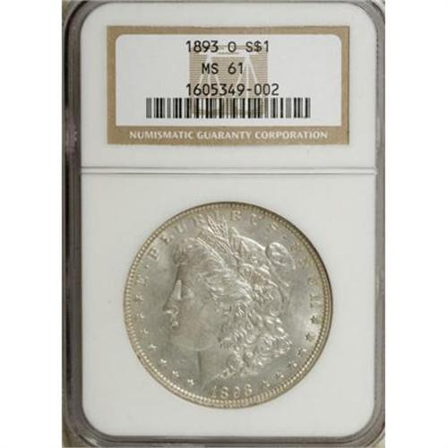 <B>1893-O $1 MS61 NGC.</B></I> The 1893-O is the lowest mintage New Orleans Morgan dollar (300,000 pieces), and is elusive in Mint State. This MS61 specimen displays soft luster, is color free save for wisps of tan-gold at the reverse margins, and exhibits the usual softness in the centers. A few light marks and luster grazes are visible on the obverse.<BR><BR><B>Coin Engraver:</B> George T. Morgan<BR><BR><b>Shipping:</b> Coins & Currency (<a target="_blank" href="http://www.heritageauctions.com/common/shipping.php">view shipping information</a>)