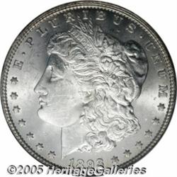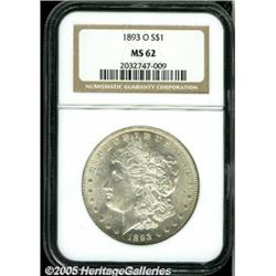 <B>1893-O<img border='0' src='http://www.heritagecoins.com/images/star.gif' width=10 height=10>$1 MS62 NGC.</B></I> A very scarce date with only 300,000 pieces struck. As is typical for the issue, the centers are softly struck, probably from improperly basined dies. The luster is quite bright with a satiny appearance and a few small marks serve to limit the grade.
