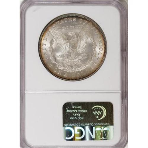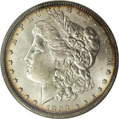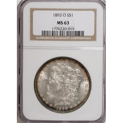 <B>1893-O $1 MS63 NGC.</B></I> The 1893-O is the lowest mintage New Orleans Morgan dollar (300,000 pieces), and is scarce in circulated grades and scarce to rare in Mint State. The lustrous surfaces of this Select example are toned in cobalt-blue, lavender, and gold-tan at the margins, and the design elements exhibit sharp detail, save for the usually seen softness in the centers. The few minuscule marks scattered about are perhaps fewer than what might be expected for the grade classification.<BR><BR><B>Coin Engraver:</B> George T. Morgan<BR><BR><b>Shipping:</b> Coins & Currency (<a target="_blank" href="http://www.heritageauctions.com/common/shipping.php">view shipping information</a>)