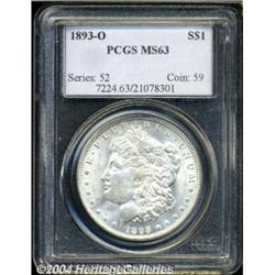 <table><tbody><tr><td><table> <TR><TD width="100%"><TABLE cellSpacing=1 cellPadding=3 width="100%" border=0><TBODY><TR><TD width="100%" bgColor=#79735c><FONT face=arial color=#ffffff size=3><B>Description</B> </FONT></TD></TR><TR><TD width="100%" bgColor=#ffffff><FONT face=arial size=2><B>1893-O $1 MS63 PCGS.</B></I> With only 300,000 pieces originally struck, the 1893-O has the lowest mintage of any New Orleans Mint Morgan Dollar issue. This is a shimmering, untoned example that has smooth, soft mint frost over each side and there are just a few modest facial scuffs and shallow blemishes to the left of the portrait. As usually encountered, the central details are somewhat weakly defined over Liberty's ear and on the eagle's breast.<BR><I>From the Dylan Elijah Collection of Morgan Dollars.</B></I> </FONT></TD></TR></TBODY></TABLE></TD></TR></TBODY></TABLE><BR><A name=PricesRealized></A><TABLE cellSpacing=0 cellPadding=0 width="100%" bgColor=#000000 border=0><TBODY><TR><TD width="100%"><TABLE cellSpacing=1 cellPadding=3 width="100%" border=0><TBODY><TR><TD width="100%" bgColor=#79735c><A name=PR><FONT face=arial color=#ffffff size=3><B>Previous Prices from Heritage Auctions</B> </FONT></A></TD></TR><TR><TD bgColor=#f6f6ed><TABLE cellSpacing=0 cellPadding=0 width="100%" border=1><TBODY><TR><TD align=middle width="33%"><B>Date</B></TD><TD align=middle width="33%"><B>Service</B></TD><TD align=middle width="33%"><B>Price</B></TD></TR><TR bgColor=whitesmoke><TD width="33%"><B>12/07/1999</B></TD><TD width="33%">NGC</TD><TD width="33%">$3,600.00</TD></TR><TR bgColor=whitesmoke><TD width="33%"><B>09/20/2003</B></TD><TD width="33%">PCGS</TD><TD width="33%">$4,600.00</TD></TR><TR bgColor=whitesmoke><TD width="33%"><B>07/29/2003</B></TD><TD width="33%">PCGS</TD><TD width="33%">$5,290.00</TD></TR><TR bgColor=whitesmoke><TD width="33%"><B>03/01/2003</B></TD><TD width="33%">NGC</TD><TD width="33%">$3,680.00</TD></TR><TR bgColor=whitesmoke><TD width="33%"><B>11/23/2002</B></TD><TD width="33%">PCGS</TD><TD width="33%">$5,462.50</TD></TR><TR bgColor=whitesmoke><TD width="33%"><B>09/28/2002</B></TD><TD width="33%">PCGS</TD><TD width="33%">$4,600.00</TD></TR><TR bgColor=whitesmoke><TD width="33%"><B>04/27/2002</B></TD><TD width="33%">PCGS</TD><TD width="33%">$4,370.00</TD></TR><TR bgColor=whitesmoke><TD width="33%"><B>10/06/2001</B></TD><TD width="33%">NGC</TD><TD width="33%">$3,478.75</TD></TR><TR bgColor=whitesmoke><TD width="33%"><B>02/23/2001</B></TD><TD width="33%">PCGS</TD><TD width="33%">$5,290.00</TD></TR><TR bgColor=whitesmoke><TD width="33%"><B>02/11/2000</B></TD><TD width="33%">NGC</TD><TD width="33%">$3,737.50</TD></TR><TR bgColor=whitesmoke><TD width="33%"><B>11/18/1999</B></TD><TD width="33%">PCGS</TD><TD width="33%">$4,370.00</TD></TR><TR bgColor=whitesmoke><TD width="33%"><B>08/13/1999</B></TD><TD width="33%">PCGS</TD><TD width="33%">$5,462.50</TD></TR><TR bgColor=whitesmoke><TD width="33%"><B>02/12/1999</B></TD><TD width="33%">ANACS</TD><TD width="33%">$4,485.00</TD></TR><TR bgColor=whitesmoke><TD width="33%"><B>03/21/1998</B></TD><TD width="33%">NGC</TD><TD width="33%">$3,795.00</TD></TR><TR bgColor=whitesmoke><TD width="33%"><B>02/13/1998</B></TD><TD width="33%">PCGS</TD><TD width="33%">$4,840.00</TD></TR><TR bgColor=whitesmoke><TD width="33%"><B>08/02/1997</B></TD><TD width="33%">PCGS</TD><TD width="33%">$5,635.00</TD></TR><TR bgColor=whitesmoke><TD width="33%"><B>06/01/1996</B></TD><TD width="33%">PCGS</TD><TD width="33%">$4,950.00</TD></TR><TR bgColor=whitesmoke><TD width="33%"><B>07/26/1994</B></TD><TD width="33%">PCGS</TD><TD width="33%">$3,300.00</TD></TR><TR bgColor=whitesmoke><TD width="33%"><B>05/22/1993</B></TD><TD width="33%">PCGS</TD><TD width="33%">$3,960.00</TD></TR><TR bgColor=whitesmoke><TD width="33%"><B>01/01/1996</B></TD><TD width="33%">ANACS</TD><TD width="33%">$3,740.00</TD></TR><TR bgColor=whitesmoke><TD width="33%"><B>05/01/1999</B></TD><TD width="33%">NGC</TD><TD width="33%">$4,140.00</TD></TR><TR bgColor=whitesmoke><TD width="33%"><B>02/01/2000</B></TD><TD width="33%">PCGS</TD><TD width="33%">$4,485.00</TD></TR><TR bgColor=whitesmoke><TD width="33%"><B>03/01/1996</B></TD><TD width="33%">PCGS</TD><TD width="33%">$4,840.00</TD></TR><TR bgColor=whitesmoke><TD width="33%"><B>06/22/2000</B></TD><TD width="33%">PCGS</TD><TD width="33%">$3,680.00</TD></TR><TR bgColor=whitesmoke><TD width="33%"><B>01/01/2001</B></TD><TD width="33%">PCGS</TD><TD width="33%">$3,910.00</TD></TR></TBODY></TABLE></TD></TR><TR><TD bgColor=#ffffff><FONT face=arial size=1 ?>PLEASE NOTE: All prices realized reflect the final hammer price PLUS the buyer's premium in auctions that charge a buyer's premium. Each item has a notation at the top of the listing indicating whether that lot included a buyer's premium. Example: A item that sells with a final hammer price of $100 and a 20% buyer's premium will display with a price realized of $120. All information listed is intended to be as accurate as possible, but errors are possible. Please use this guide carefully and inform us of any inaccuracies. </FONT></TD></TR></TBODY></TABLE></TD></TR></TBODY></TABLE><BR><TABLE cellSpacing=0 cellPadding=0 width="100%" bgColor=#000000 border=0><TBODY><TR><TD width="100%"><TABLE cellSpacing=1 cellPadding=3 width="100%" border=0><TBODY><TR><TD width="100%" bgColor=#79735c colSpan=6><FONT face=arial color=#ffffff size=3><B>Price Guide*</B> </FONT></TD></TR><TR bgColor=#f6f6ed><TD align=middle><B>Grade</B> </TD><TD align=middle><B>Coin World<BR>(Trends)</B> </TD><TD align=middle><B>Numismedia<BR>Retail</B> </TD><TD align=middle><B>Numismedia<BR>Wholesale</B> </TD><TD align=middle><B>Coin<BR>Universe</B> </TD><TD align=middle><B>Heritage<BR>Value Index</B> </TD></TR><TR bgColor=#ffffff><TD align=middle>62</TD><TD align=right>$3,000.00</TD><TD align=right>---</TD><TD align=right>$2,375.00</TD><TD align=right>$2,550.00</TD><TD align=right>$2,512.50</TD></TR><TR style="FONT-WEIGHT: bold" bgColor=#cccfdd><TD align=middle>63