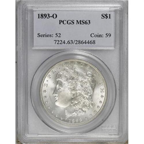 <B>1893-O $1 MS63 PCGS.</B></I> The centers have a hint of gold toning, but this lustrous and attractively preserved better date dollar is close to brilliant. The hair above the ear is incompletely brought up, as usual for the issue. The 1893-O is the lowest mintage New Orleans dollar, and provides good value relative to its heavily promoted San Francisco counterpart.<BR><BR><B>Coin Engraver:</B> George T. Morgan<BR><BR><b>Shipping:</b> Coins & Currency (<a target="_blank" href="http://www.heritageauctions.com/common/shipping.php">view shipping information</a>)