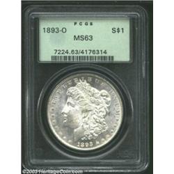 <TR><TD width="100%"><TABLE cellSpacing=1 cellPadding=3 width="100%" border=0><TBODY><TR><TD width="100%" bgColor=#79735c><FONT face=arial color=#ffffff size=3><B>Description</B> </FONT></TD></TR><TR><TD width="100%" bgColor=#ffffff><FONT face=arial size=2><B>1893-O $1 MS63 PCGS.</B></I> An even finer representative of this major condition rarity among O-mint Morgan Dollars. The bright, frosty-white surfaces have far better than the expected definition in the centers and also benefit from sparkling cartwheel luster. A great find for the serious collector of this widely collected series. </FONT></TD></TR></TBODY></TABLE></TD></TR></TBODY></TABLE><BR><A name=PricesRealized></A><TABLE cellSpacing=0 cellPadding=0 width="100%" bgColor=#000000 border=0><TBODY><TR><TD width="100%"><TABLE cellSpacing=1 cellPadding=3 width="100%" border=0><TBODY><TR><TD width="100%" bgColor=#79735c><A name=PR><FONT face=arial color=#ffffff size=3><B>Previous Prices from Heritage Auctions</B> </FONT></A></TD></TR><TR><TD bgColor=#f6f6ed><TABLE cellSpacing=0 cellPadding=0 width="100%" border=1><TBODY><TR><TD align=middle width="33%"><B>Date</B></TD><TD align=middle width="33%"><B>Service</B></TD><TD align=middle width="33%"><B>Price</B></TD></TR><TR bgColor=whitesmoke><TD width="33%"><B>11/23/2002</B></TD><TD width="33%">PCGS</TD><TD width="33%">$5,462.50</TD></TR><TR bgColor=whitesmoke><TD width="33%"><B>09/28/2002</B></TD><TD width="33%">PCGS</TD><TD width="33%">$4,600.00</TD></TR><TR bgColor=whitesmoke><TD width="33%"><B>02/28/2002</B></TD><TD width="33%">PCGS</TD><TD width="33%">$4,600.00</TD></TR><TR bgColor=whitesmoke><TD width="33%"><B>06/08/2002</B></TD><TD width="33%">PCGS</TD><TD width="33%">$4,485.00</TD></TR><TR bgColor=whitesmoke><TD width="33%"><B>06/01/1996</B></TD><TD width="33%">PCGS</TD><TD width="33%">$1,100.00</TD></TR><TR bgColor=whitesmoke><TD width="33%"><B>08/02/1997</B></TD><TD width="33%">PCGS</TD><TD width="33%">$5,635.00</TD></TR><TR bgColor=whitesmoke><TD width="33%"><B>06/07/2000</B></TD><TD width="33%">PCGS</TD><TD width="33%">$4,657.50</TD></TR><TR bgColor=whitesmoke><TD width="33%"><B>07/26/1994</B></TD><TD width="33%">PCGS</TD><TD width="33%">$3,300.00</TD></TR><TR bgColor=whitesmoke><TD width="33%"><B>11/18/1999</B></TD><TD width="33%">PCGS</TD><TD width="33%">$4,370.00</TD></TR><TR bgColor=whitesmoke><TD width="33%"><B>10/01/1993</B></TD><TD width="33%">PCGS</TD><TD width="33%">$3,355.00</TD></TR><TR bgColor=whitesmoke><TD width="33%"><B>02/23/2001</B></TD><TD width="33%">PCGS</TD><TD width="33%">$5,290.00</TD></TR><TR bgColor=whitesmoke><TD width="33%"><B>02/13/1998</B></TD><TD width="33%">PCGS</TD><TD width="33%">$4,840.00</TD></TR><TR bgColor=whitesmoke><TD width="33%"><B>04/01/1999</B></TD><TD width="33%">PCGS</TD><TD width="33%">$5,445.00</TD></TR><TR bgColor=whitesmoke><TD width="33%"><B>01/01/2000</B></TD><TD width="33%">PCGS</TD><TD width="33%">$4,025.00</TD></TR><TR bgColor=whitesmoke><TD width="33%"><B>06/01/1996</B></TD><TD width="33%">NGC</TD><TD width="33%">$3,410.00</TD></TR><TR bgColor=whitesmoke><TD width="33%"><B>12/07/1999</B></TD><TD width="33%">NGC</TD><TD width="33%">$3,600.00</TD></TR><TR bgColor=whitesmoke><TD width="33%"><B>08/07/1999</B></TD><TD width="33%">NGC</TD><TD width="33%">$4,140.00</TD></TR><TR bgColor=whitesmoke><TD width="33%"><B>02/01/1998</B></TD><TD width="33%">NGC</TD><TD width="33%">$4,180.00</TD></TR><TR bgColor=whitesmoke><TD width="33%"><B>02/11/2000</B></TD><TD width="33%">NGC</TD><TD width="33%">$3,737.50</TD></TR><TR bgColor=whitesmoke><TD width="33%"><B>03/01/1999</B></TD><TD width="33%">NGC</TD><TD width="33%">$3,910.00</TD></TR><TR bgColor=whitesmoke><TD width="33%"><B>01/11/2003</B></TD><TD width="33%">ANACS</TD><TD width="33%">$3,335.00</TD></TR><TR bgColor=whitesmoke><TD width="33%"><B>02/12/1999</B></TD><TD width="33%">ANACS</TD><TD width="33%">$4,485.00</TD></TR><TR bgColor=whitesmoke><TD width="33%"><B>01/01/1996</B></TD><TD width="33%">ANACS</TD><TD width="33%">$3,740.00</TD></TR></TBODY></TABLE></TD></TR><TR><TD bgColor=#ffffff><FONT face=arial size=1 ?>PLEASE NOTE: All prices realized reflect the final hammer price PLUS the buyer's premium in auctions that charge a buyer's premium. Each item has a notation at the top of the listing indicating whether that lot included a buyer's premium. Example: A item that sells with a final hammer price of $100 and a 20% buyer's premium will display with a price realized of $120. All information listed is intended to be as accurate as possible, but errors are possible. Please use this guide carefully and inform us of any inaccuracies. </FONT></TD></TR></TBODY></TABLE></TD></TR></TBODY></TABLE><BR><TABLE cellSpacing=0 cellPadding=0 width="100%" bgColor=#000000 border=0><TBODY><TR><TD width="100%"><TABLE cellSpacing=1 cellPadding=3 width="100%" border=0><TBODY><TR><TD width="100%" bgColor=#79735c colSpan=6><FONT face=arial color=#ffffff size=3><B>Price Guide*</B> </FONT></TD></TR><TR bgColor=#f6f6ed><TD align=middle><B>Grade</B> </TD><TD align=middle><B>Coin World<BR>(Trends)</B> </TD><TD align=middle><B>Numismedia<BR>Retail</B> </TD><TD align=middle><B>Numismedia<BR>Wholesale</B> </TD><TD align=middle><B>Coin<BR>Universe</B> </TD><TD align=middle><B>Heritage<BR>Value Index</B> </TD></TR><TR bgColor=#ffffff><TD align=middle>62</TD><TD align=right>$3,000.00</TD><TD align=right>---</TD><TD align=right>$2,000.00</TD><TD align=right>$2,550.00</TD><TD align=right>$2,170.00</TD></TR><TR style="FONT-WEIGHT: bold" bgColor=#cccfdd><TD align=middle>63</TD><TD align=right>$6,250.00</TD><TD align=right>---</TD><TD align=right>$4,250.00</TD><TD align=right>$6,750.00</TD><TD align=right>$4,218.75</TD></TR><TR bgColor=#ffffff><TD align=middle>64</TD><TD align=right>$14,500.00</TD><TD align=right>---</TD><TD align=right>$16,550.00</TD><TD align=right>$17,500.00</TD><TD align=right>$10,675.00</TD></TR><TR bgColor=#ffffff><TD colSpan=6><FONT size=1>*All information listed is intended to be as accurate as p