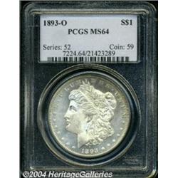 <table><tbody><tr><td><table> <TR><TD width="100%"><TABLE cellSpacing=1 cellPadding=3 width="100%" border=0><TBODY><TR><TD width="100%" bgColor=#79735c><FONT face=arial color=#ffffff size=3><B>Description</B> </FONT></TD></TR><TR><TD width="100%" bgColor=#ffffff><FONT face=arial size=2><B>1893-O $1 MS64 PCGS.</B></I> A mere 300,000 pieces were struck of the 1893-O Dollar and it is widely regarded as one of the great condition rarities in the Morgan series. Only 59 pieces have been certified in MS64 by PCGS with 9 finer (10/03)--not many coins for the thousands of Morgan Dollar collectors in this country. This piece has surprisingly smooth surfaces for an MS64 and each side is mostly brilliant with just a touch of light peripheral toning. Well struck, but not completely brought up at the center of the obverse, this is a premium coin for the grade that will be of great interest to a wide variety of Dollar collectors.<BR><I>From The Phillip Wertheimer Collection.</B></I> </FONT></TD></TR></TBODY></TABLE></TD></TR></TBODY></TABLE><BR><A name=PricesRealized></A><TABLE cellSpacing=0 cellPadding=0 width="100%" bgColor=#000000 border=0><TBODY><TR><TD width="100%"><TABLE cellSpacing=1 cellPadding=3 width="100%" border=0><TBODY><TR><TD width="100%" bgColor=#79735c><A name=PR><FONT face=arial color=#ffffff size=3><B>Previous Prices from Heritage Auctions</B> </FONT></A></TD></TR><TR><TD bgColor=#f6f6ed><TABLE cellSpacing=0 cellPadding=0 width="100%" border=1><TBODY><TR><TD align=middle width="33%"><B>Date</B></TD><TD align=middle width="33%"><B>Service</B></TD><TD align=middle width="33%"><B>Price</B></TD></TR><TR bgColor=whitesmoke><TD width="33%"><B>07/30/2002</B></TD><TD width="33%">PCGS</TD><TD width="33%">$8,625.00</TD></TR><TR bgColor=whitesmoke><TD width="33%"><B>04/27/2002</B></TD><TD width="33%">NGC</TD><TD width="33%">$8,337.50</TD></TR><TR bgColor=whitesmoke><TD width="33%"><B>01/12/2002</B></TD><TD width="33%">NGC</TD><TD width="33%">$8,855.00</TD></TR><TR bgColor=whitesmoke><TD width="33%"><B>01/05/2001</B></TD><TD width="33%">PCGS</TD><TD width="33%">$15,525.00</TD></TR><TR bgColor=whitesmoke><TD width="33%"><B>09/13/1997</B></TD><TD width="33%">PCGS</TD><TD width="33%">$11,500.00</TD></TR><TR bgColor=whitesmoke><TD width="33%"><B>02/03/1995</B></TD><TD width="33%">NGC</TD><TD width="33%">$14,575.00</TD></TR><TR bgColor=whitesmoke><TD width="33%"><B>06/01/2000</B></TD><TD width="33%">PCGS</TD><TD width="33%">$9,200.00</TD></TR><TR bgColor=whitesmoke><TD width="33%"><B>01/01/1999</B></TD><TD width="33%">NGC</TD><TD width="33%">$7,187.00</TD></TR><TR bgColor=whitesmoke><TD width="33%"><B>11/01/1999</B></TD><TD width="33%">PCGS</TD><TD width="33%">$13,200.00</TD></TR></TBODY></TABLE></TD></TR><TR><TD bgColor=#ffffff><FONT face=arial size=1 ?>PLEASE NOTE: All prices realized reflect the final hammer price PLUS the buyer's premium in auctions that charge a buyer's premium. Each item has a notation at the top of the listing indicating whether that lot included a buyer's premium. Example: A item that sells with a final hammer price of $100 and a 20% buyer's premium will display with a price realized of $120. All information listed is intended to be as accurate as possible, but errors are possible. Please use this guide carefully and inform us of any inaccuracies. </FONT></TD></TR></TBODY></TABLE></TD></TR></TBODY></TABLE><BR><TABLE cellSpacing=0 cellPadding=0 width="100%" bgColor=#000000 border=0><TBODY><TR><TD width="100%"><TABLE cellSpacing=1 cellPadding=3 width="100%" border=0><TBODY><TR><TD width="100%" bgColor=#79735c colSpan=6><FONT face=arial color=#ffffff size=3><B>Price Guide*</B> </FONT></TD></TR><TR bgColor=#f6f6ed><TD align=middle><B>Grade</B> </TD><TD align=middle><B>Coin World<BR>(Trends)</B> </TD><TD align=middle><B>Numismedia<BR>Retail</B> </TD><TD align=middle><B>Numismedia<BR>Wholesale</B> </TD><TD align=middle><B>Coin<BR>Universe</B> </TD><TD align=middle><B>Heritage<BR>Value Index</B> </TD></TR><TR bgColor=#ffffff><TD align=middle>63</TD><TD align=right>$6,250.00</TD><TD align=right>---</TD><TD align=right>$4,375.00</TD><TD align=right>$6,750.00</TD><TD align=right>$4,673.75</TD></TR><TR style="FONT-WEIGHT: bold" bgColor=#cccfdd><TD align=middle>64</TD><TD align=right>$20,000.00</TD><TD align=right>---</TD><TD align=right>$16,500.00</TD><TD align=right>$17,500.00</TD><TD align=right>$12,200.00</TD></TR><TR bgColor=#ffffff><TD align=middle>65</TD><TD align=right>---</TD><TD align=right>---</TD><TD align=right>$180,000.00</TD><TD align=right>$250,000.00</TD><TD align=right>$149,833.33</TD></TR><TR bgColor=#ffffff><TD colSpan=6><FONT size=1>*All information listed is intended to be as accurate as possible, but errors are possible. No item may be returned or refused based on this information which is provided as a service to our customers. You should contact each pricing source directly to determine the accuracy of this information. </FONT></TD></TR></TBODY></TABLE></TD></TR></TBODY></TABLE><BR><TABLE cellSpacing=0 cellPadding=0 width="100%" bgColor=#000000 border=0><TBODY><TR><TD width="100%"><TABLE cellSpacing=1 cellPadding=3 width="100%" border=0><TBODY><TR><TD width="100%" bgColor=#79735c><FONT face=arial color=#ffffff size=3><B>Population Guide</B> </FONT></TD></TR><TR bgColor=#ffffff><TD align=middle><!-- Begin Output of Population Grid--><TABLE cellSpacing=0 cellPadding=0 width="100%" border=0><TBODY><TR><TD vAlign=center><TABLE cellSpacing=0 width="100%" border=1 cellsadding="3"><TBODY><TR><TD vAlign=center><TABLE cellSpacing=0 cellPadding=3 width="100%" border=1><TBODY><TR><TD vAlign=center align=middle bgColor=#f0f1e8 colSpan=2 <CENTER><FONT face=Arial size=2><B>PCGS Pop </B></FONT><CENTER></CENTER></TD><TD vAlign=center align=middle bgColor=#f0f1e8 colSpan=2><CENTER><FONT face=Arial size=2><B>NGC Pop</B></CENTER></FONT></TD></TR><TR><TD vAlign=center><FONT face=Arial size=2>(64)</FONT> </TD><TD vAlign=center align=right><FONT face=Arial size=2>59</FONT> </TD><TD vA