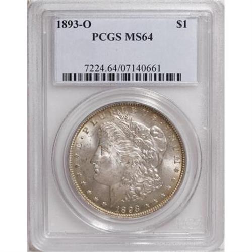 <B>1893-O $1 MS64 PCGS.</B></I> Noteworthy as the lowest mintage New Orleans Morgan dollar (300,000 pieces), the 1893-O is rare in all Mint State grades and becomes a key to the series at the MS64 level. The present near-Gem has pleasing luster, and lovely tan-gold color throughout the margins while the centers are mostly untoned, save for a hint of silver-gray color. A few minute obverse marks preclude a higher grade. Like virtually all 1893-O dollars, the strike is a bit soft in the centers, which does not reduce the imposing eye appeal. This piece would hold a place of honor within even the finest specialized collection. Population: 81 in 64, 10 finer (6/07).<BR><BR><B>Coin Engraver:</B> George T. Morgan<BR><BR><b>Shipping:</b> Coins & Currency (<a target="_blank" href="http://www.heritageauctions.com/common/shipping.php">view shipping information</a>\)