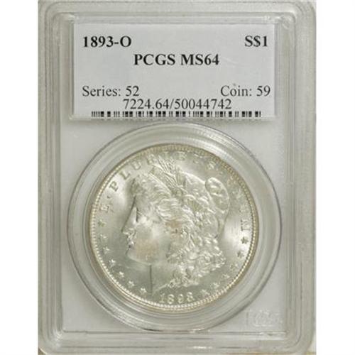 <B>1893-O $1 MS64 PCGS.</B></I> Though Wayne Miller's <I>The Morgan and Peace Dollar Textbook</B></I> was written well over two decades ago, his commentary on the 1893-O issue holds up even today: "Because of its low mintage, the 1893-O is scarce in any grade. It is especially elusive in uncirculated condition. Most such specimens exhibit an excessive amount of bagmarks, which often concentrate on Liberty's face, and indifferent luster."<BR> The Choice example offered here ducks this trend, easily identifiable today in certified population data. While the strike is typically soft at the central devices, the overall visual appeal is pleasing, largely due to the subtle luster of the silver-gray fields and the surprisingly well-preserved portrait. PCGS has graded a mere seven finer examples (1/08).<BR><I>From The Oxford Collection.</B></I><BR><BR><B>Coin Engraver:</B> George T. Morgan<BR><BR><b>Shipping:</b> Coins & Currency (<a target="_blank" href="http://www.heritageauctions.com/common/shipping.php">view shipping information</a>)