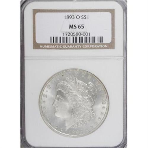 <B>1893-O $1 MS65 NGC.</B></I> <B>1893-O MS65 NGC.</B></I> Ten obverse dies were shipped to the New Orleans mint in 1893 but no new reverse dies shipped. The reverse dies used for this issue were leftover from previous years. Altogether only five varieties are known of this very scarce issue, struck from three obverse dies and two old reverse dies. No more were apparently needed to produce the paltry mintage of only 300,000 coins, but the usage of leftover reverse dies may go a long way toward explaining why the striking details are less than sterling on the majority of 1893-O dollars.<BR> On this particular piece the striking definition is somewhat weak both on the eagle's breast as well as on Liberty's hair over the ear. However, there is no doubt about the outstanding quality of this Morgan rarity. Unlike the dull luster seen on many examples, the surfaces on this piece are bright with the semi-prooflike sheen that is sometimes encountered. This is significant as it adds more eye appeal to the coin, and as Wayne Miller pointed out "Semi-prooflike specimens ... are often more attractive than fully prooflike pieces." The reason for this is that often times when a fully prooflike 1893-O is located it is heavily abraded. On this coin there are no distinctive marks on either side, just a few shallow luster breaks on the obverse.<BR> The 1893-O has always been on the radar screen of New Orleans collectors as the scant output of 300,000 pieces was the lowest in the entire series of O-mint dollars. Beginning in the late 1950s, when silver dollar collecting began to gain widespread popularity, it began to be noticed that no bags of this issue were available and what few rolls were available brought a substantial premium. Today it is recognized that the '93-O is scarce in all grades and very rare in the better grades of Mint State. It is extremely rare in Gem condition and this is one of only three Gems we have handled in the past ten years. NGC has only certified one other piece as a Gem with one finer (6/07), while PCGS has graded nine pieces as MS65 with none finer (6/07).<BR><I>From the Reuben Reinstein Collection.</B></I><BR><BR><b>Shipping:</b> Coins & Currency (<a target="_blank" href="http://www.heritageauctions.com/common/shipping.php">view shipping information</a>)