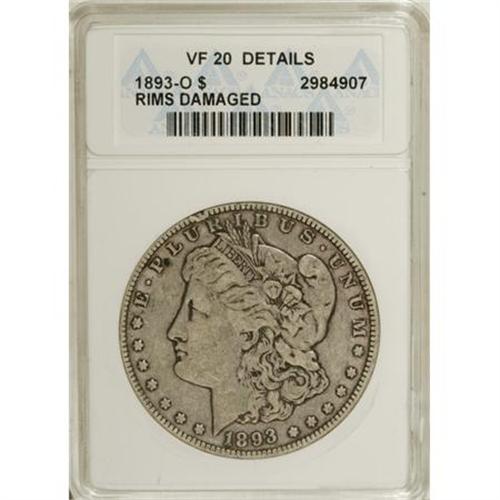 <B>1893-O $1 --Rim Damaged--ANACS. VF20 Details.</B></I> NGC Census: (22/1390). PCGS Population (33/1846). Mintage: 300,000. Numismedia Wsl. Price for NGC/PCGS coin in VF20: $300. (#7224)<BR><BR><b>Shipping:</b> Coins & Currency (<a target="_blank" href="http://www.heritageauctions.com/common/shipping.php">view shipping information</a>)
