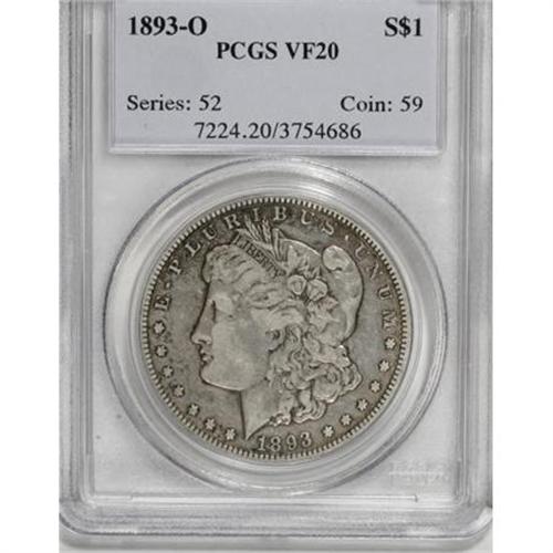 <B>1893-O $1 VF20 PCGS.</B></I> PCGS Population (35/1916). NGC Census: (22/1422). Mintage: 300,000. Numismedia Wsl. Price for NGC/PCGS coin in VF20: $300. (#7224)<BR><BR><B>Coin Engraver:</B> George T. Morgan<BR><BR><b>Shipping:</b> Coins & Currency (<a target="_blank" href="http://www.heritageauctions.com/common/shipping.php">view shipping information</a>)