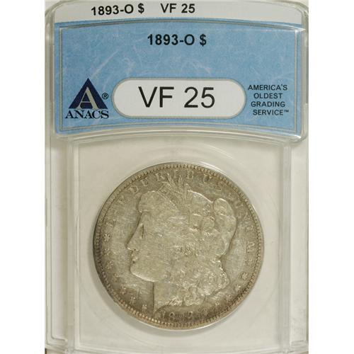 <B>1893-O $1 VF25 ANACS.</B></I> NGC Census: (0/1512). PCGS Population (39/1818). Mintage: 300,000. Numismedia Wsl. Price for NGC/PCGS coin in VF25: $310. (#7224)<BR><BR><b>Shipping:</b> Coins & Currency (<a target="_blank" href="http://www.heritageauctions.com/common/shipping.php">view shipping information</a>)