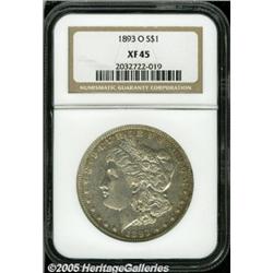 <B>1893-O<img border='0' src='http://www.heritagecoins.com/images/star.gif' width=10 height=10>$1 XF45 NGC.</B></I> Light rubbing is seen over the highpoints of the design. A lightly toned example of this scarce issue, that reveals traces of luster in the protected areas.