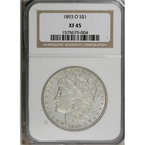 <B>1893-O $1 XF45 NGC.</B></I> NGC Census: (119/1134). PCGS Population (158/1509). Mintage: 300,000. Numismedia Wsl. Price for NGC/PCGS coin in XF45: $571. (#7224)<BR><BR><B>Coin Engraver:</B> George T. Morgan<BR><BR><b>Shipping:</b> Coins & Currency (<a target="_blank" href="http://www.heritageauctions.com/common/shipping.php">view shipping information</a>)