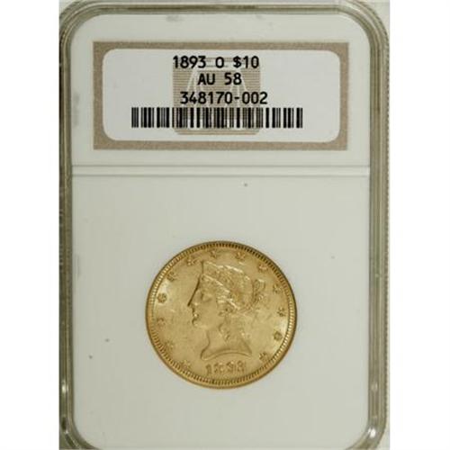 <B>1893-O $10 AU58 NGC.</B></I> NGC Census: (77/236). PCGS Population (47/316). Mintage: 17,000. Numismedia Wsl. Price for NGC/PCGS coin in AU58: $408. (#8727)<BR><BR><b>Shipping:</b> Coins & Currency (<a target="_blank" href="http://www.heritageauctions.com/common/shipping.php">view shipping information</a>)