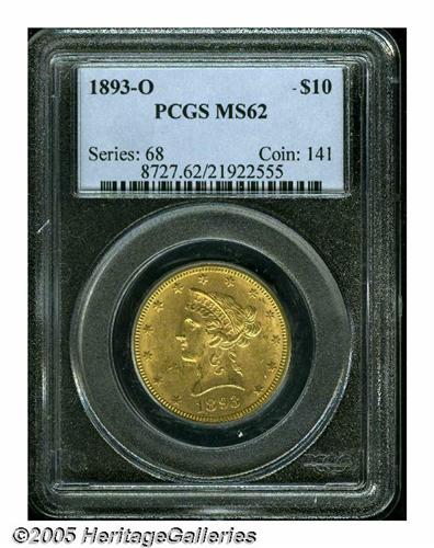<B>1893-O<$10> MS62 PCGS.</B></I> A few lower stars are not fully impressed, the strike is generally sharp overall. A tiny spot concealed on the lower right (facing) wing is the sole detraction. A popular, low mintage O-mint issue.
