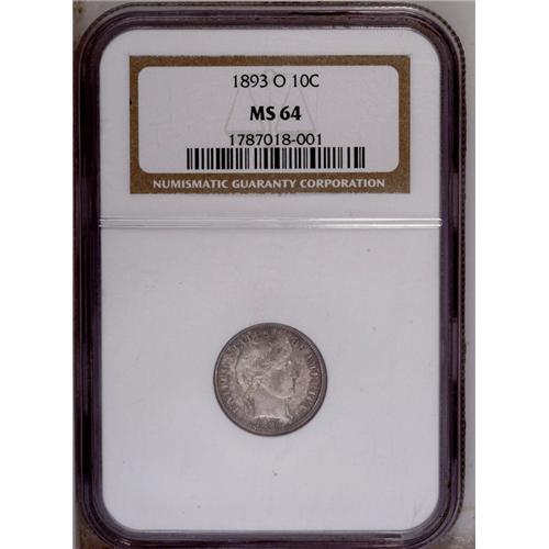 <B>1893-O 10C MS64 NGC.</B></I> Mottled dove-gray and cobalt-blue toning embraces this shimmering, well struck near-Gem. Refreshingly unabraded and clearly original. A light obverse die crack travels from the bust truncation to the rim. While this issue is not an especially low-mintage date, with 1,760,000 pieces coined, it is nonetheless difficult to find in Mint State. Census: 31 in 64, 12 finer (12/05).