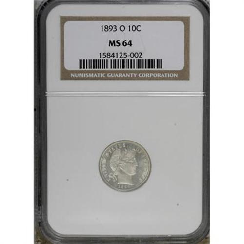 <B>1893-O 10C MS64 NGC.</B></I> The fields of this minimally toned Barber dime are uncommonly reflective, though the mirrors are not strong enough for a Prooflike designation. Excellent surface quality and strike for a New Orleans product. Census: 35 in 64, 17 finer (1/08).<BR><BR><B>Coin Engraver:</B> Charles E. Barber<BR><BR><b>Shipping:</b> Coins & Currency (<a target="_blank" href="http://www.heritageauctions.com/common/shipping.php">view shipping information</a>)