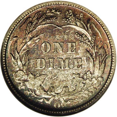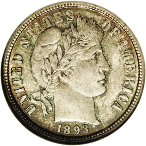 <B>1893-O<10C> MS65 NGC.</B></I> From a modest original mintage of 1.76 million coins comes this absolutely gorgeous Gem Barber dime. The 1893-O was not preserved in significant numbers, and most Mint State survivors grade no finer than Choice BU. NGC and PCGS combined have certified only 15 MS65's, with 16 graded higher. The present example is sharply struck, and reveals minimally abraded lustrous surfaces. Dappled olive-gray patina competes with touches of reddish-gold at the margins, while the reverse is a mix of golden-orange and mottled lavender and olive coloration. Census: 7 in 65, 7 finer (3/06).