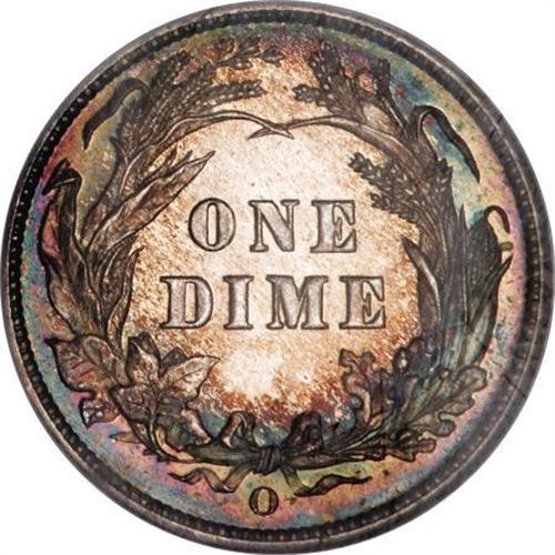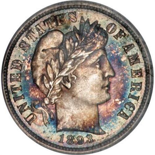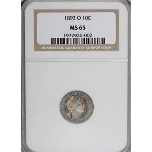 <B>1893-O 10C MS65 NGC.</B></I> The 1893-O, with a mintage of 1.76 million, was apparently not saved to any great extent, prompting David Lawrence to say that the issue is "fairly tough in all grades." Most Uncirculated pieces appear to be in the MS62 to MS64 grade ranges, as evidenced by NGC and PCGS population data. About 16 Gem examples have been certified by both services combined, and fewer than 20 pieces higher (11/07). The MS65 coin in this lot displays medium intensity cobalt-blue, lavender, and gold-brown toning around the borders, with a window of near-brilliance in the centers. The design elements are sharply defined.<BR><BR><B>Coin Engraver:</B> Charles E. Barber<BR><BR><b>Shipping:</b> Coins & Currency (<a target="_blank" href="http://www.heritageauctions.com/common/shipping.php">view shipping information</a>)