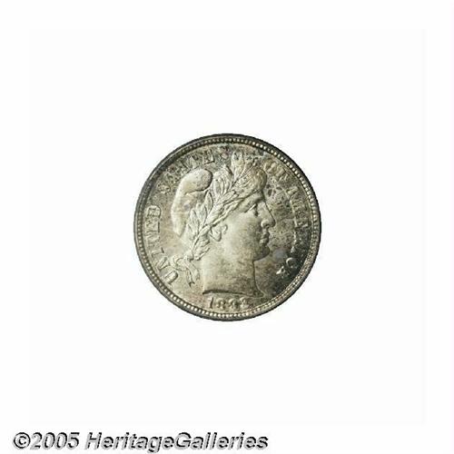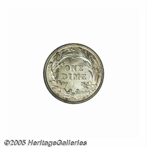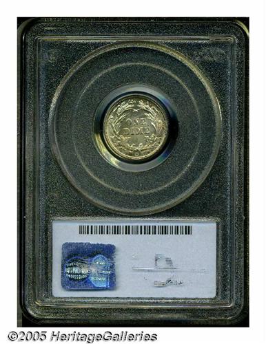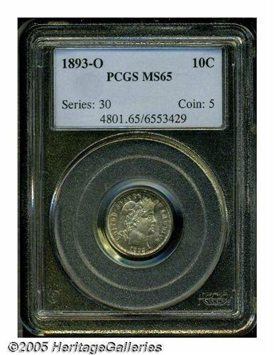 <B>1893-O<10C> MS65 PCGS.</B></I> A scarcer O-mint issue and a lower mintage one as well with only 1.76 million pieces produced. This lustrous piece is far above average in terms of preservation and has just a bit of striking softness on the wreath ribbons and the forefront of Liberty's curls. Light golden toning is seen over each side with a speckling of blue and rose toning around the obverse rim. Population: 7 in 65, 9 finer (6/05).