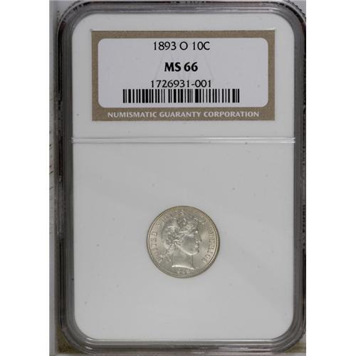 <B>1893-O<10C> MS66 NGC.</B></I> A brilliant and shimmering Premium Gem. A nicely struck and nearly immaculate piece with a few minuscule mint-made planchet flaws along the obverse border. The 1893-O is a scarcer issue in Mint State, courtesy of its lower mintage and its circulation prior to the popularity of collecting by mintmark. Opportunities to acquire examples above the MS65 grade level are few and far between. Census: 5 in 66, 2 finer (9/06).