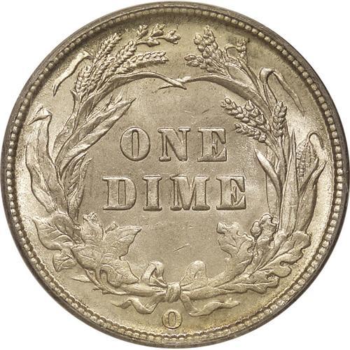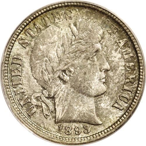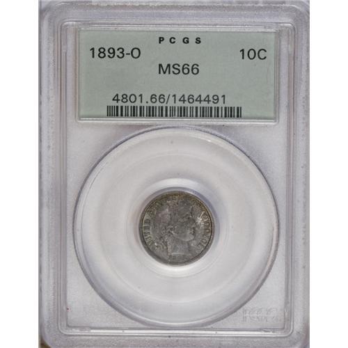 <B>1893-O<10C> MS66 PCGS.</B></I> A wonderfully preserved, second-year New Orleans issue that is layered in mottled greenish-gray toning on the obverse, while pale golden accents have gathered about the reverse periphery. Sharply struck, except for the lower half of the wreath, and virtually pristine on both sides. The 1893-O Barber dime is scarce in all Mint State grades, and rare at the Premium Gem level or finer. Population: 6 in 66, 3 finer (6/06).<BR><I>From The Belle Glade Collection.</B></I> <BR><BR><B>Important