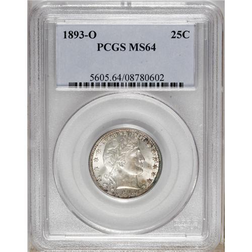 <B>1893-O<25C> MS64 PCGS.</B></I> Choice and solidly struck with pleasing luster. The reverse is brilliant, but the lightly marked obverse has red and violet patina at the periphery. Population: 37 in 64, 20 finer (7/06).