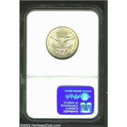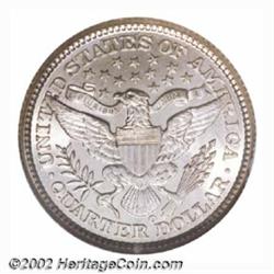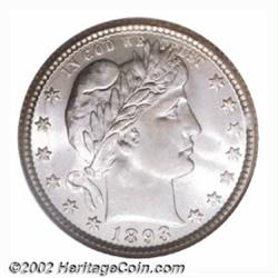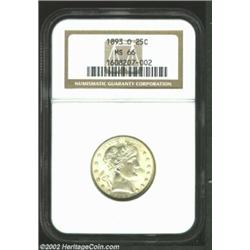 1893-O 25C MS66 NGC. There is a wide variance in striking definition on 1893-O Quarters. Some are well brought up, such as this piece, and others are, well let's just say, not quite as nice. The mint luster on this coin is exceptional and frosted in nature, more suggestive of an S-mint than a coin from New Orleans. The surfaces are smooth and almost free of abrasions, and the mint brilliance is surrounded by a ring of pale golden over the denticles on each side. Population: 5 in 66, 4 finer (7/02). Important notice: We expect to be auctioning lots at the rate of 200-250 per hour. Sometimes eBay Premier live bid software cannot keep up with that pace, so we strongly recommend that you place a realistic proxy bid now as insurance to avoid disappointment. Also please note that all Heritage/CAA lots purchased through eBay Premier carry a 20% Buyer's Premium. Please make sure you read the Terms and Conditions.