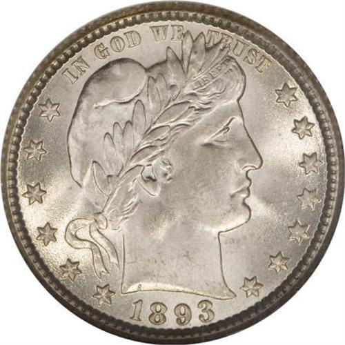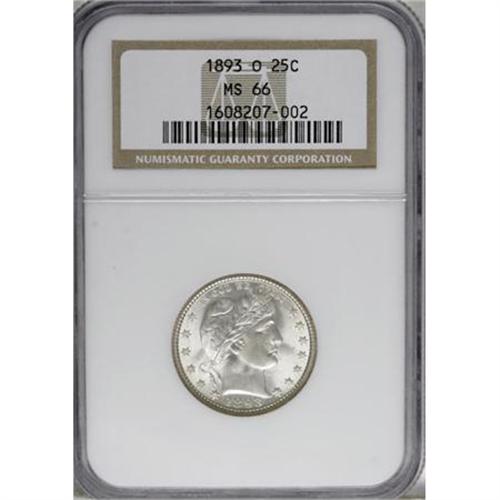 <B>1893-O 25C MS66 NGC.</B></I> There is a wide variance in striking definition on 1893-O Quarters. Some are well brought up, such as this piece, and others are, well let's just say, not quite as nice. The mint luster on this coin is exceptional and frosted in nature, more suggestive of an S-mint than a coin from New Orleans. The surfaces are smooth and almost free of abrasions, and the mint brilliance is surrounded by a ring of pale golden over the denticles on each side. Census: 6 in 66, 5 finer (11/07). <BR><I>From The Madison Collection.</B></I><BR><BR><B>Coin Engraver:</B> Charles E. Barber<BR><BR><b>Shipping:</b> Coins & Currency (<a target="_blank" href="http://www.heritageauctions.com/common/shipping.php">view shipping information</a>)