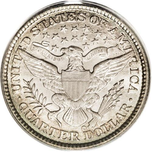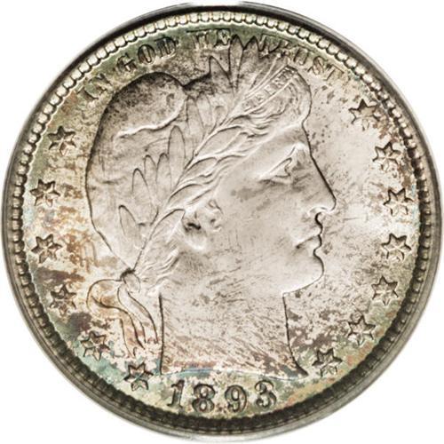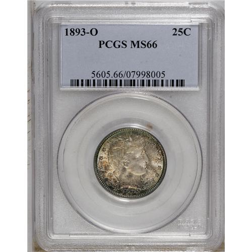 <B>1893-O<25C> MS66 PCGS.</B></I> Pretty russet and electric-blue toning graces the margins on each side of this piece. Despite a healthy mintage of 3.4 million pieces, few pieces of this emission ever remotely approach the quality of the present example. Radiant luster is a hallmark, and the strike is better than usual for this date. Perusal with a loupe reveals only minute, grade-consistent abrasions. Population: 4 in 66, 2 finer (9/06).