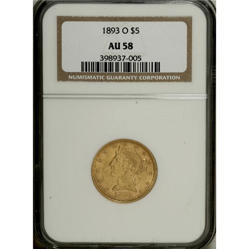 <B>1893-O $5 AU58 NGC.</B></I> NGC Census: (125/197). PCGS Population (34/90). Mintage: 110,000. Numismedia Wsl. Price: $480. (#8385)<BR><BR><b>Shipping:</b> Coins & Currency (<a target="_blank" href="http://www.heritageauctions.com/common/shipping.php">view shipping information</a>)