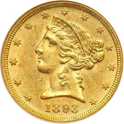 1893-O $5 Liberty. NGC graded MS-61. Well struck and fully lustrous with the normal assortment of tiny "chattermarks" in the unprotected fields. Pop 98; 83 finer. Only 110,000 minted.