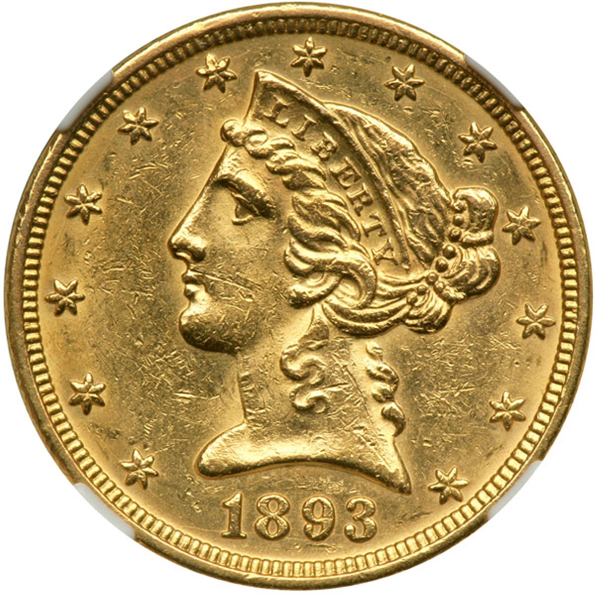 1893-O $5 Liberty. NGC Unc Details, improperly cleaned. A nice bold strike, untoned. Only 1,000 examples are estimated to have survived out of the 110,000 original mintage according to experts (PCGS # 8385) .