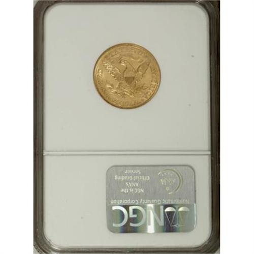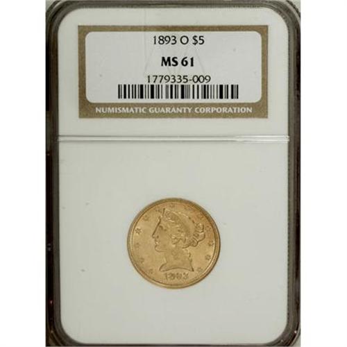 <B>1893-O $5 MS61 NGC.</B></I> This fully lustrous example will appeal to series specialists due to its low mintage and associated low population. This is a sharply detailed yellow-gold example with brilliant mint frost and splashes of orange toning.<BR><BR><b>Shipping:</b> Coins & Currency (<a target="_blank" href="http://www.heritageauctions.com/common/shipping.php">view shipping information</a>)