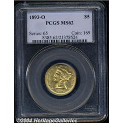 <B>1893-O<$5> MS62 PCGS.</B></I> A bright and lustrous representative with a typical strike on the eagle's neck and fletchings, although the wings and portrait are relatively crisp. Among the more available Motto New Orleans issues, but nonetheless scarce with full mint luster. Population: 23 in 62, 24 finer (7/04). <BR><BR><B>Important notice:</B> Heritage usually auctions material at the rate of 200-250 lots per hour. On some occasions eBay Live bid software or the Internet may not be able to keep up with the pace of the auction. We recommend placing a realistic absentee bid now as insurance to avoid disappointment. Occasionally the auctioneer may eliminate or reject an eBay Live bid, and the auctioneer may also reopen a lot after the close of the eBay live bidding (usually because we missed an audience bid), and may reject your bid even if it shows you as the winning bidder. By bidding via eBay Live, you agree that Heritage may award the lot to another bidder at its sole discretion under the circumstances described above or any other reasonable circumstances. Since eBay bids are not shown to us until we open the lot on the floor, we treat those bids just like floor bids. In most cases the floor responds before the eBay bid is presented to us, due to Internet lag time, so for consistency we have made it a policy that floor bids are always considered first over tie eBay live bids. Also please note that all Heritage lots purchased through eBay Live carry a 20% Buyer's Premium. Please make sure you read the Terms and Conditions before you bid. </span></font></tr></table></td></tr></table>