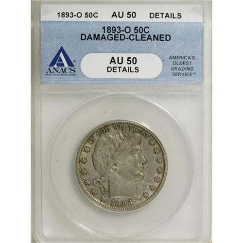 <B>1893-O 50C --Cleaned, Damaged--ANACS. AU50 Details.</B></I> NGC Census: (2/137). PCGS Population (11/162). Mintage: 1,389,000. Numismedia Wsl. Price for NGC/PCGS coin in AU50: $350. (#6466)<BR><BR><B>Coin Engraver:</B> Charles E. Barber<BR><BR><b>Shipping:</b> Coins & Currency (<a target="_blank" href="http://www.heritageauctions.com/common/shipping.php">view shipping information</a>)