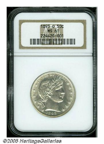 <B>1893-O<50C> MS61 NGC.</B></I> Well struck, lustrous, and untoned, with a bright satiny sheen, minimal marks for the grade, and a few wispy hairlines on the obverse.