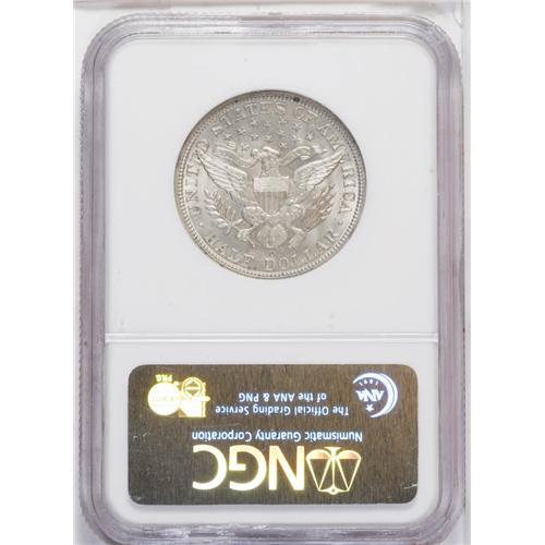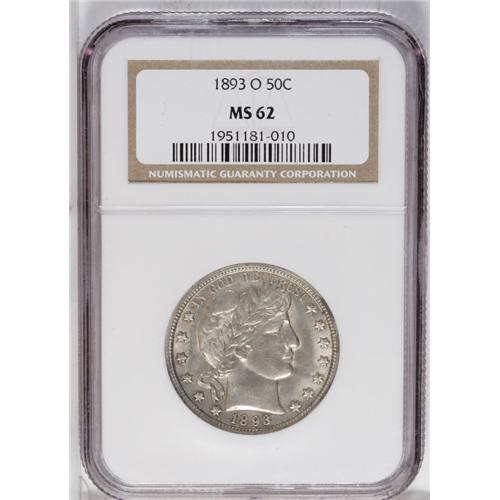 <B>1893-O<50C> MS62 NGC.</B></I> A satiny silver-gray New Orleans type coin held back in grade by nearly invisible slide marks on the cheek. Two tiny aqua-blue spots are present on the reverse at 6:30. Struck from clashed dies.