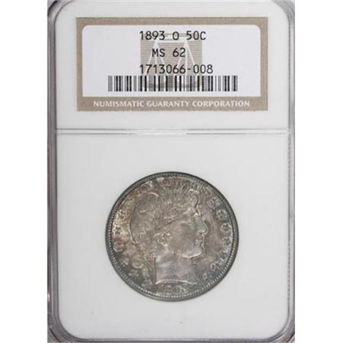 <B>1893-O 50C MS62 NGC.</B></I> Dappled peach, amethyst, and azure patina mingles with silver-gray on each side of this early O-mint Barber half. Satiny and well-defined with wispy abrasions on each side.<BR><BR><B>Coin Engraver:</B> Charles E. Barber<BR><BR><b>Shipping:</b> Coins & Currency (<a target="_blank" href="http://www.heritageauctions.com/common/shipping.php">view shipping information</a>)