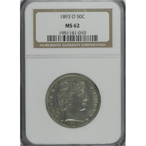 <B>1893-O 50C MS62 NGC.</B></I> A satiny silver-gray New Orleans Barber half that shows two tiny dots of aqua patina near the lower reverse rim. Well-defined with a few wispy slide marks on the cheek that preclude a finer designation.<BR><BR><B>Coin Engraver:</B> Charles E. Barber<BR><BR><b>Shipping:</b> Coins & Currency (<a target="_blank" href="http://www.heritageauctions.com/common/shipping.php">view shipping information</a>)