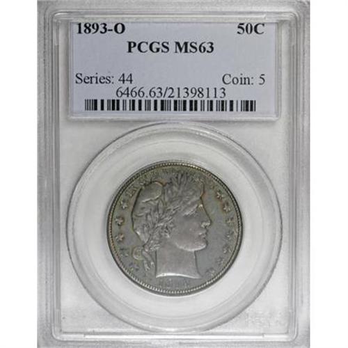 <B>1893-O 50C MS63 PCGS.</B></I> Rich sapphire and amethyst patina predominates on this shining Select piece, though the flashy fields show emerald and orange accents as well. The portrait is boldly defined, though the eagle's right (facing) wing and lower body show softness.<BR><BR><B>Coin Engraver:</B> Charles E. Barber<BR><BR><b>Shipping:</b> Coins & Currency (<a target="_blank" href="http://www.heritageauctions.com/common/shipping.php">view shipping information</a>)