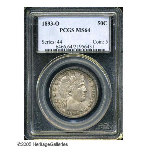 <B>1893-O<50C> MS64 PCGS.</B></I> Nicely struck for this often substandard second-year issue and layered in wholly original shades of golden-orange and purple, with flashes of turquoise color seen periodically at the margins. Population: 34 in 64, 7 finer (11/05).