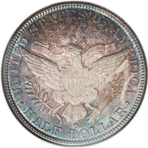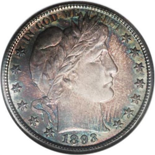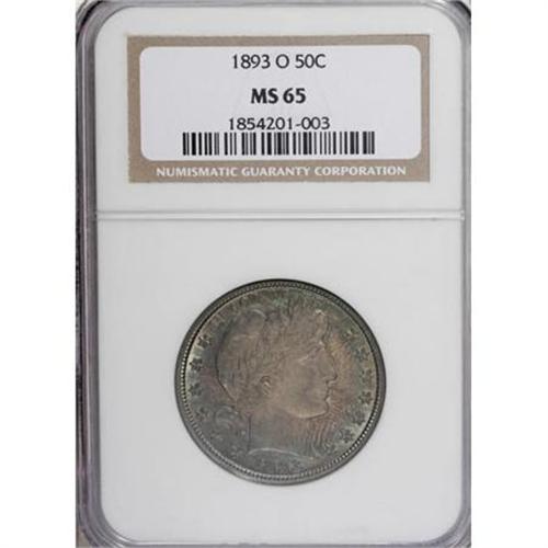 <B>1893-O 50C MS65 NGC.</B></I> The deep autumn-gold centers are bounded by lush blue-green margins. The devices have plum-gray highlights. The lustrous and unabraded surfaces exude eye appeal, and the strike is only slightly incomplete near the right shield corner and fletchings. Census: 5 in 65, 2 finer (6/07).<BR><I>From The Belle Glade Collection, Part Two.</B></I><BR><BR><B>Coin Engraver:</B> Charles E. Barber<BR><BR><b>Shipping:</b> Coins & Currency (<a target="_blank" href="http://www.heritageauctions.com/common/shipping.php">view shipping information</a>\)