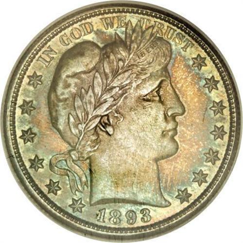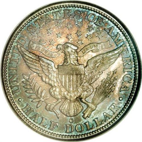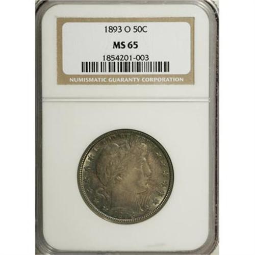<B>1893-O 50C MS65 NGC.</B></I> The deep autumn-gold centers are bounded by lush blue-green margins. The devices have plum-gray highlights. The lustrous and unabraded surfaces exude eye appeal, and the strike is only slightly incomplete near the right shield corner and fletchings. Census: 6 in 65, 2 finer (2/08).<BR><I>From The Chippewa Valley Collection.</B></I><BR><BR><B>Coin Engraver:</B> Charles E. Barber<BR><BR><b>Shipping:</b> Coins & Currency (<a target="_blank" href="http://www.heritageauctions.com/common/shipping.php">view shipping information</a>)
