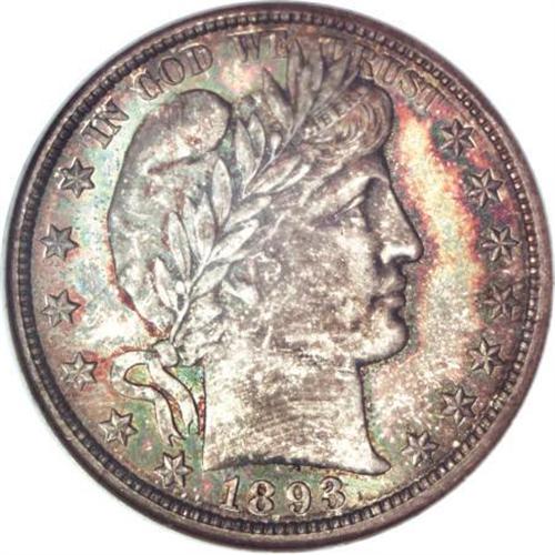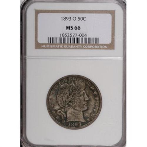 <B>1893-O 50C MS66 NGC.</B></I> Though the New Orleans Mint re-opened years after the end of the Civil War, the only Mint shuttered by that conflict to do so, it was never as relevant as it had been before, and almost without exception, mintages were small. With its mintage of under 1.4 million pieces, the 1893-O half is a low-mintage issue that was not saved in quantity at the time of release, and so high-end examples are highly elusive today.<BR> The present piece is one of just five MS66-graded examples certified by either NGC or PCGS (1/08), and it offers immense visual appeal. Deep green-gold, tan, and silver-blue shadings grace each side, and the well struck devices are beautifully preserved. In sum, an impressive survivor.<BR><BR><B>Coin Engraver:</B> Charles E. Barber<BR><BR><b>Shipping:</b> Coins & Currency (<a target="_blank" href="http://www.heritageauctions.com/common/shipping.php">view shipping information</a>)