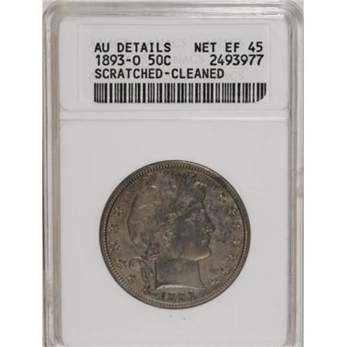 <B>1893-O 50C --Cleaned, Scratched--ANACS. AU Details, Net XF45.</B></I> NGC Census: (4/142). PCGS Population (14/173). Mintage: 1,389,000. Numismedia Wsl. Price for NGC/PCGS coin in XF45: $311. (#6466)<BR><BR><B>Coin Engraver:</B> Charles E. Barber<BR><BR><b>Shipping:</b> Coins & Currency (<a target="_blank" href="http://www.heritageauctions.com/common/shipping.php">view shipping information</a>)