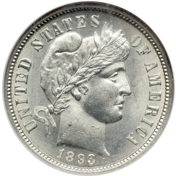 1893-O. NGC graded MS-65. Well struck and totally white. Highly attractive luster brightens this crisply struck and nearly mark-free Gem. Shimmering white in all areas. The 1893-O is a scarcer date in all grades, since the mintage was only 1,760,000 pieces. Pop 8; 6 in 66, 3 in 67.