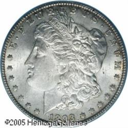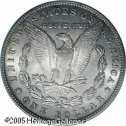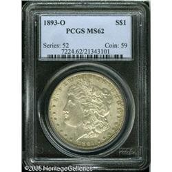 <B>1893-O<img border='0' src='http://www.heritagecoins.com/images/star.gif' width=10 height=10>$1 MS62 PCGS.</B></I> Typically struck, with softness above Liberty's ear and on the eagle's breast. The surfaces are satiny and lightly toned, showing mostly dove-gray color, with golden patina near the peripheries and clinging to some of the devices. There are a few wispy abrasions on both sides. A scarce, semi-key issue in the Morgan Dollar series, as only 300,000 pieces were originally struck. Relatively few examples survive today in Mint State. Lot:10424