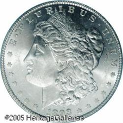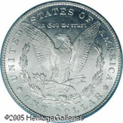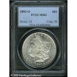 <B>1893-O<img border='0' src='http://www.heritagecoins.com/images/star.gif' width=10 height=10>$1 MS63 PCGS.</B></I> Produced in smaller numbers than any other O-mint Morgan Dollar, the 1893-O is a classic condition rarity whose elusiveness in the finer Mint State grades is further exaggerated by chronic softness of strike. Those '93-O Dollars that remained in government vaults after both the year of distribution and the mass meltings of the Pittman Act were largely paid out by 1955, after which the high grade rarity of this date started to gain widespread acceptance among dealers and collectors. A nice Select BU example, the present coin has bright, completely untoned surfaces and the fields present a semi-reflective sheen. The striking detail is average for the date with minor bluntness of detail over the central highpoints, and there are a few scattered marks over the obverse that serve to limit the grade.<BR><I>From The Banks Collection.</B></I> Lot:10425