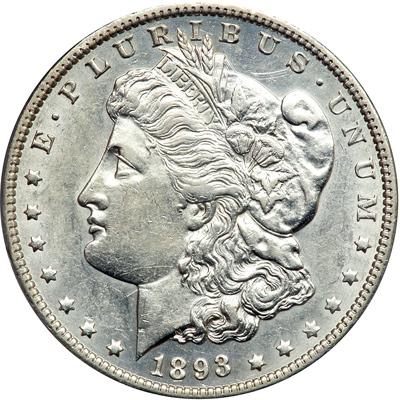 1893-O Morgan Dollar. PCGS graded AU-53. Only 300,000 struck of which 29,960 are estimated to have survived. This is a lustrous coin with appreciably nicer surfaces than average. Excellent detail on the portrait and the eagle (PCGS # 7224) .