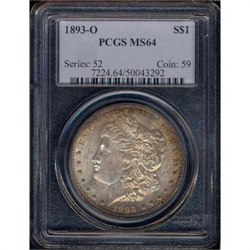 <b>1893-O Morgan Dollar. PCGS graded MS64.</b> Attractive light gray with russet gold toning on both sides. A light hairline on the cheek. Frosty and well preserved, the relatively smooth surfaces would settle for nothing less than the Mint State 64 grade. Devices were struck with the primary energy to impart the design to the outer areas but not with enough get-up-and-go by the dies to impart clear-cut centers. This is a well-known trait of the rare 1893-O and has been considered by the grading service when arriving at the grade.